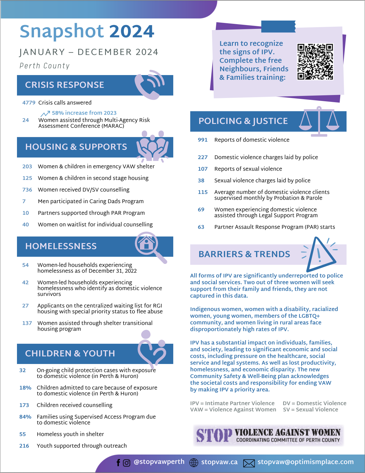 The StopVAW Coordinating Committee annually gathers local statistics to demonstrate the overlapping realities of violence against women in Perth County. This ‘snapshot’ is an initiative of the South West Regional Coordinating Committee with multiple committees across Ontario participating as well. The purpose of the snapshot is to inform the community that violence against women is a complex social issue that impacts everyone and initiate discussions about what is happening in Perth County.